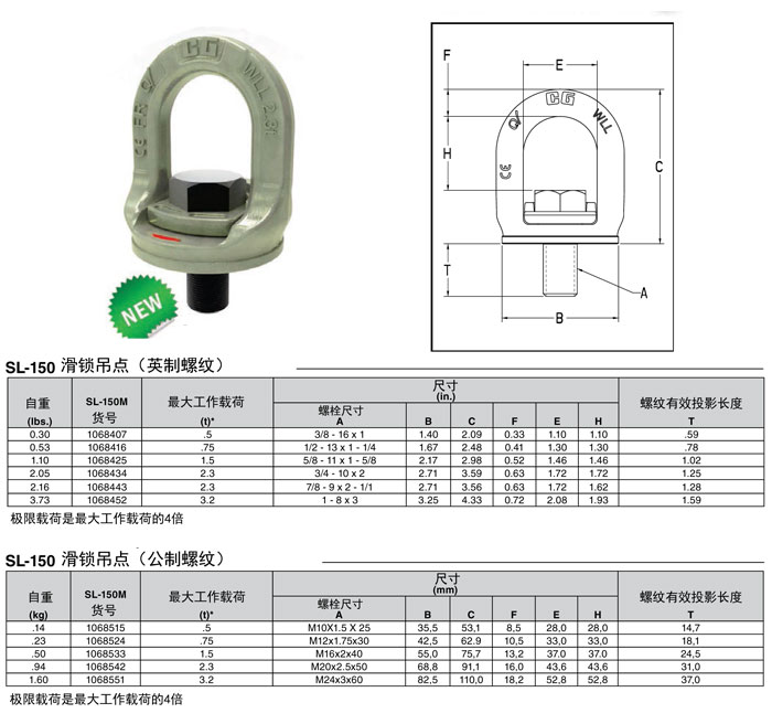 1. 相較于各種尺寸的普通環(huán)眼螺栓吊點(diǎn),SL-150滑鎖吊點(diǎn)的環(huán)眼結(jié)構(gòu)更大,可幫助輕松完成結(jié)索。