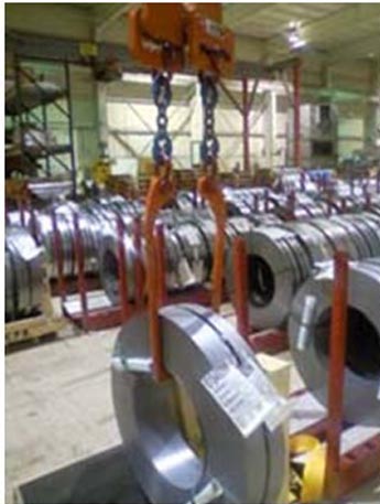 其配套使用的吊鉤具有2英寸的調(diào)節(jié)范圍,可以搬運(yùn)和移動不同厚度的卷材。Coil Plus部門維護(hù)與安全負(fù)責(zé)人Larry Wood表示,其主要特點(diǎn)是底腳可以進(jìn)行旋轉(zhuǎn),為便于鋼卷移動,吊鉤可以向下移動,這樣底腳可以降低到與鋼卷平行的位置。當(dāng)?shù)啄_到達(dá)鋼卷所處的位置時(shí)可以實(shí)現(xiàn)90°旋轉(zhuǎn),這樣就可以對目標(biāo)鋼卷進(jìn)行起吊作業(yè)而不磕碰相鄰位置上的其他鋼卷。