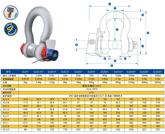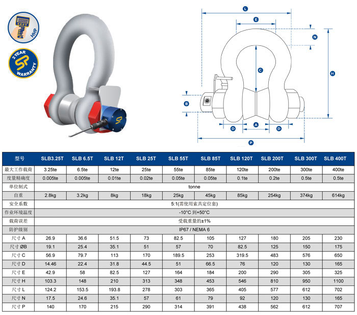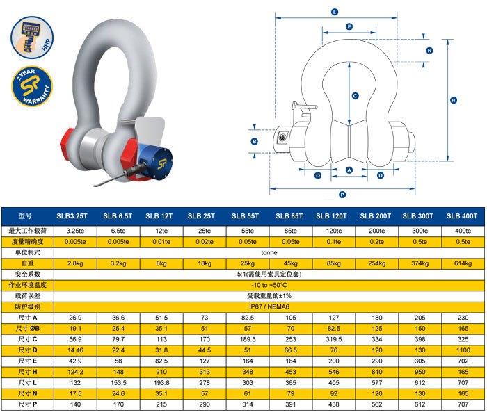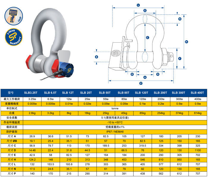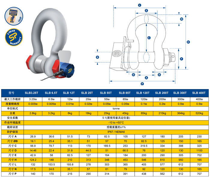 這款設(shè)備的標(biāo)準(zhǔn)負載能力范圍從3.25噸到400噸,特殊定制情況下可達到1550噸。對于負載能力低不超過120噸的設(shè)備,我們采用Crosby的G2130卸扣和G2140卸扣;對于負載能力超過120噸的設(shè)備,我們則采用GN的H10型卸扣。