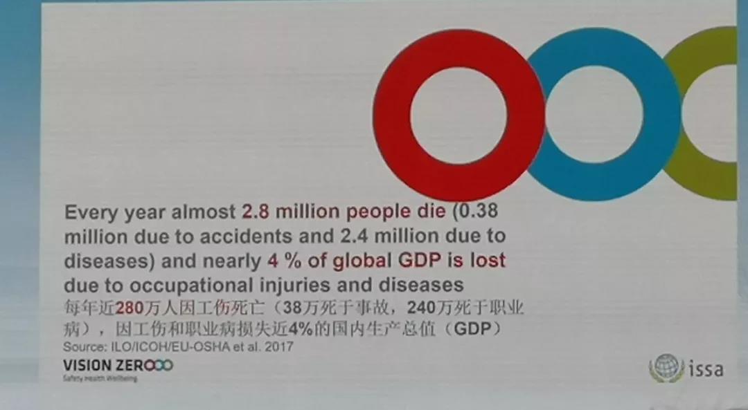這個(gè)PPT數(shù)據(jù)看到了安全生產(chǎn)的價(jià)值吧?工傷和職業(yè)病損失近4% 的GDP,ISSA的數(shù)據(jù)。注意啊,與先進(jìn)發(fā)達(dá)的中國(guó)每年公布的事故率下降和損失相比,數(shù)字又要打架了,這一次是誰(shuí)正確?但愿臺(tái)下的嘉賓看到了、聽(tīng)進(jìn)去了、有反應(yīng)。SSA 也是本論壇的合作組織者之一。