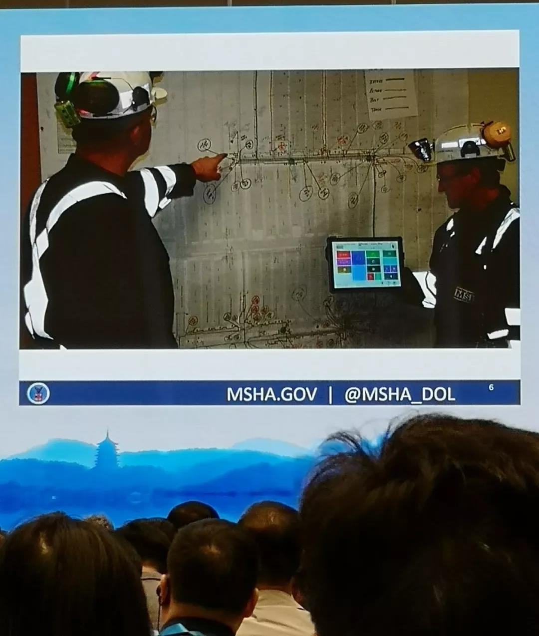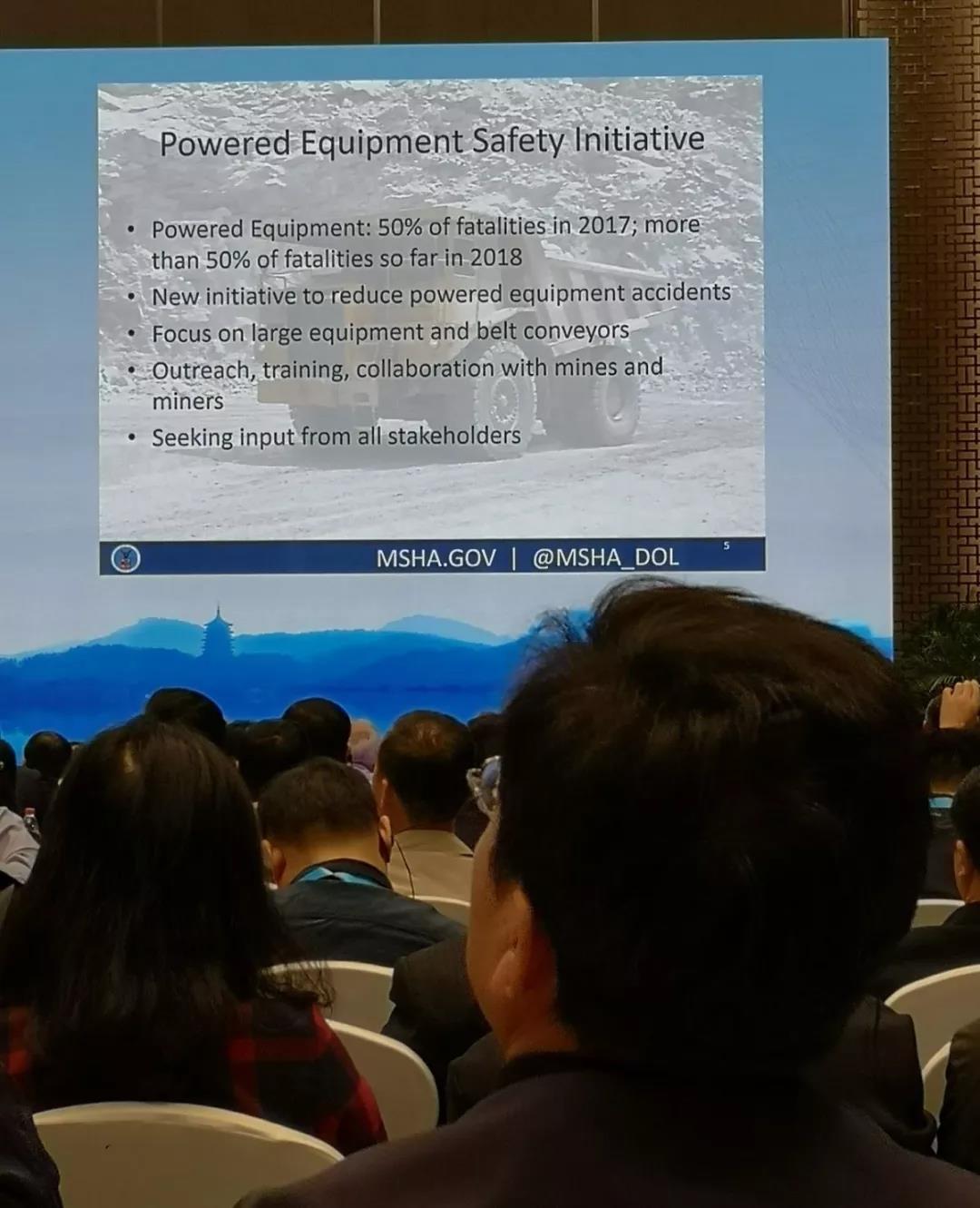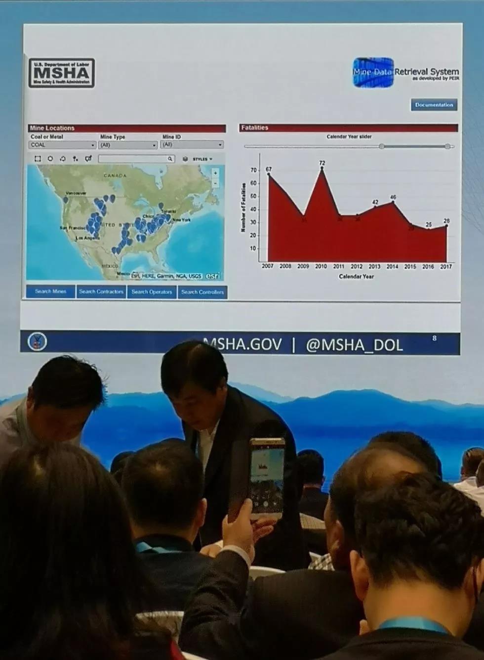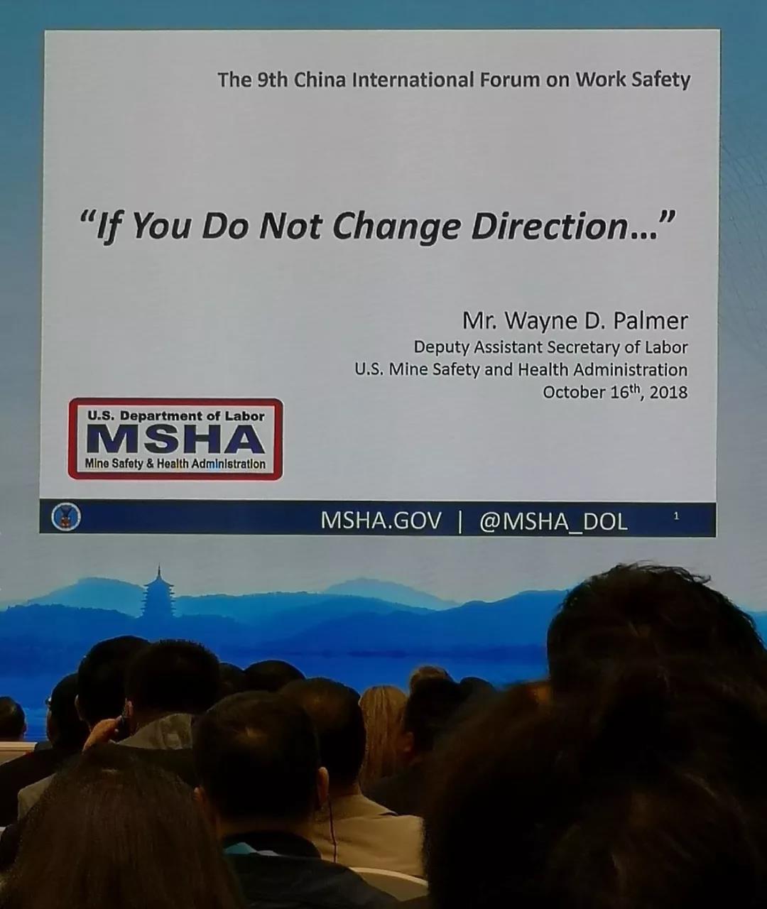 這位來(lái)自 MSHA的官員(MSHA大家知道吧:美國(guó)勞工部礦山健康安全局),他的演講題目:“if you do not change direction…… ” 一頭霧水,翻譯真為“如果你不改變方向…”,到底改不改方向?你倒是說(shuō)明白點(diǎn)!看后面一張PPT,哈,再討論。左下角,注意。旱V山職業(yè)安全局,是隸屬美國(guó)勞工部的政府部門(mén)!