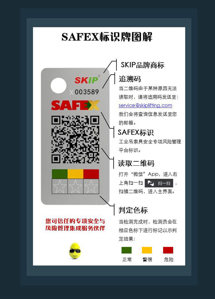 《一般用途鋼絲繩吊索特性和技術(shù)條件》(GB/T 16762-2009 )7.1.3條規(guī)定:包裝前每件吊索都應(yīng)掛有標(biāo)簽,標(biāo)牌上應(yīng)注有吊索的執(zhí)行標(biāo)準(zhǔn)、直徑長(zhǎng)度、額定工作載荷和產(chǎn)品編號(hào)。今天就帶你了解一下不一樣的SafeX索具標(biāo)牌。