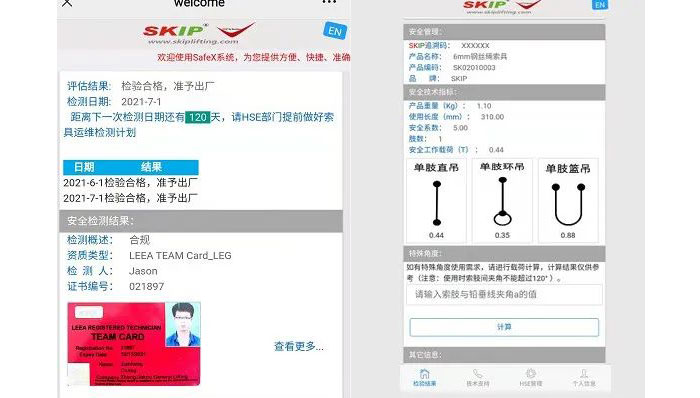 上圖為SAFEX系統(tǒng)主界面,我們看到他主要顯示了索具的評(píng)估結(jié)果、精確的過(guò)往檢驗(yàn)日期和下次檢驗(yàn)日期、索具的檢驗(yàn)人及資質(zhì)、索具的基本信息、安全技術(shù)指標(biāo)和一套非常實(shí)用的載荷計(jì)算小工具。這套系統(tǒng)界面中的信息能幫助使用者更好的了解產(chǎn)品的安全性能,在索具檢測(cè)時(shí)也能更完整清晰的記錄檢測(cè)信息,SAFEX為您的安全管理細(xì)節(jié)賦能!