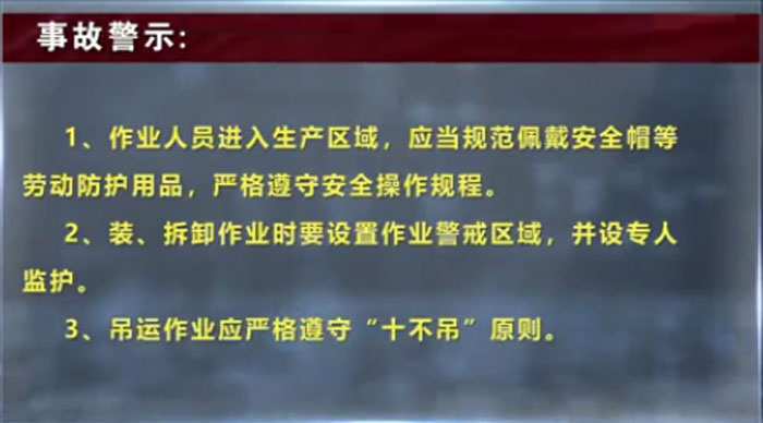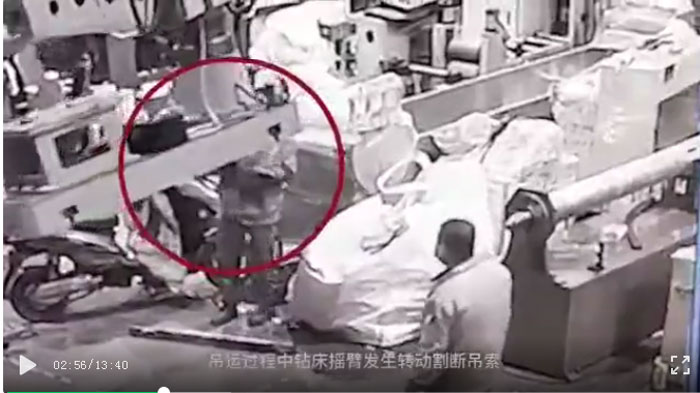 圖片事故案例發(fā)生于2020年,吊運(yùn)過程中鉆床搖臂發(fā)生轉(zhuǎn)動割斷吊索,致使紅圈中錢某當(dāng)場被砸死。